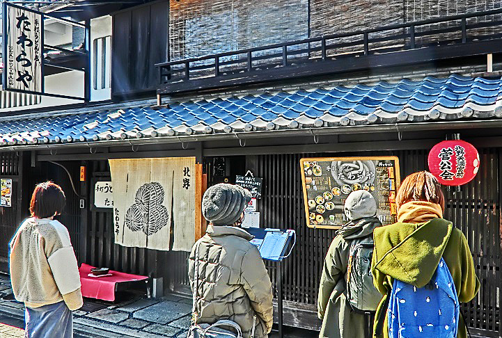 次の写真の左上に見える提灯(ちょうちん)は、「舞妓さんを呼べる店」だけに許されている、特別な目印なんですよ・・・したがって、「一見さんお断り」(見知らぬ客の入店は禁止)の高級料亭であるため、当然ながら、「お品書き」など出されておりません。
