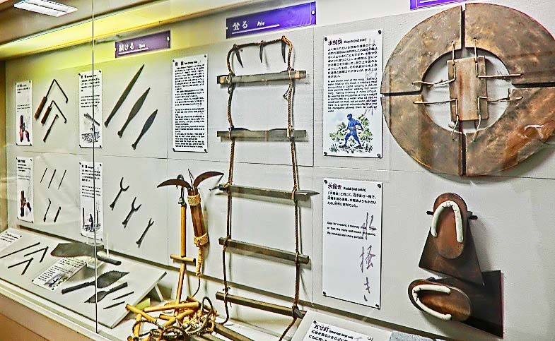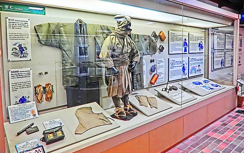 忍者屋敷での解説を、感心しながら楽しく聞き終えると、次に案内されるのは、本物の遺物を見ながら真面目なお勉強ができるという、興味深い忍者資料館・・・しかし、こんな姿で街を歩いていたら、「お前、忍者だろ!?」と、バレバレですよねぇ(笑)。