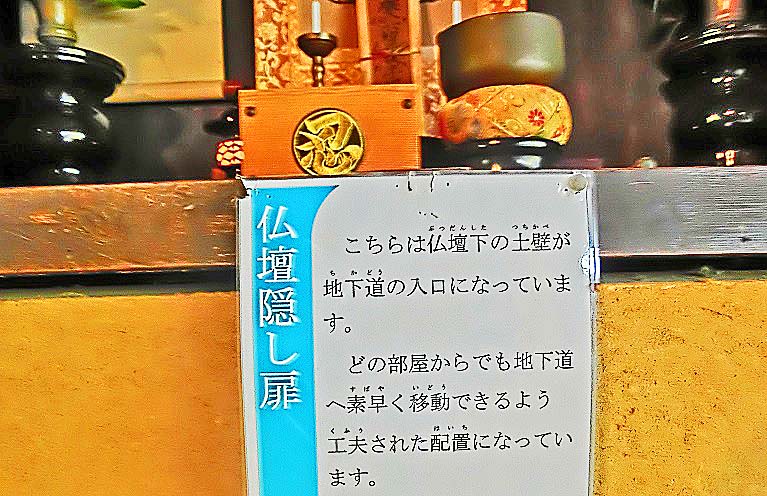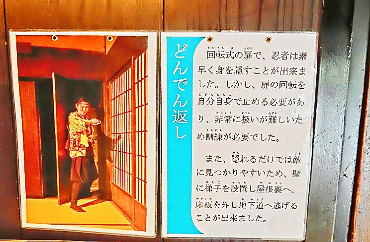 忍者屋敷の中には、さまざまな仕掛けが、隠されていますよ。例えば、有名な「どんでん返し」や、「仏壇の下から逃げる隠し扉」など・・・