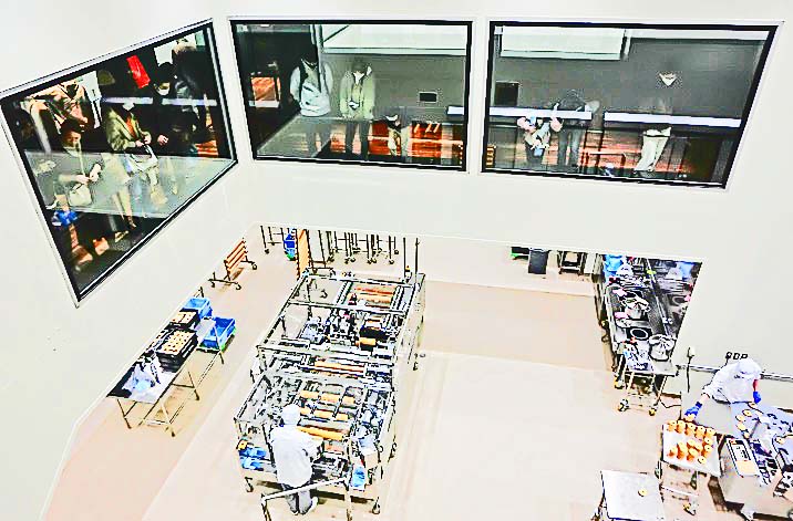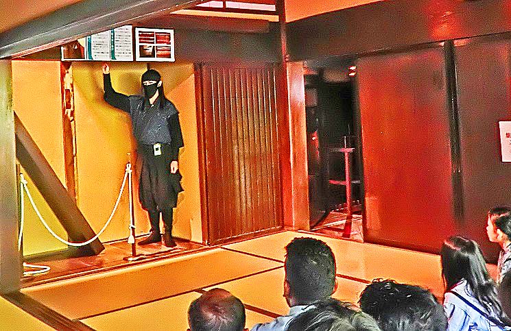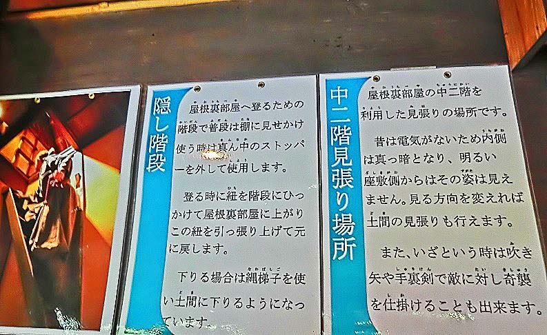 次の写真で、お兄さん(マネキンのように見えますが生きています)が実演しているのは、「隠し階段」と、「中二階(ちゅうにかい)に隠されている見張り場所」なのですが・・・