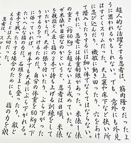 さっそく、巻物を開いて、興味シンシンで内容を熟読してみると、面白くて役に立つ情報が、ビッシリですよ。例えば、忍者はスリムな体型でなければ務まらないため、体重は「約60キログラム」を超えないように、厳しく自己管理していたとのこと・・・