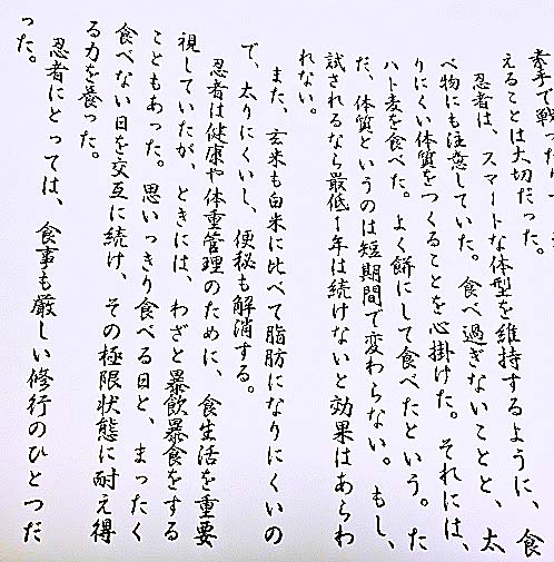 下記のように、なんと忍者は、「ときには、わざと暴飲暴食をすることもあった」とのことで、「思いっきり食べる日と、まったく食べない日を交互に続け、その極限状態に耐え得る力を養った」のだそうですよ。
