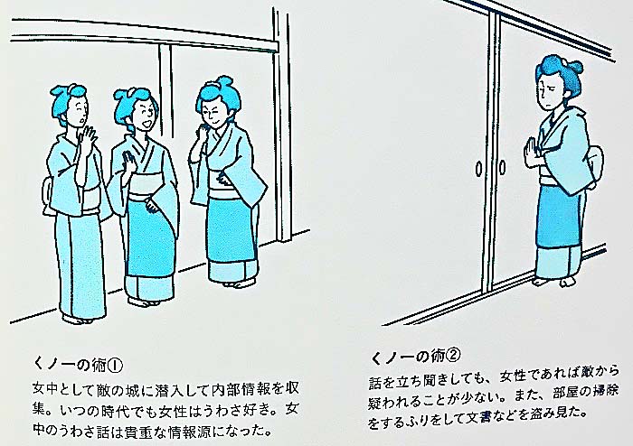 たとえば、いわゆる「くノ一」(くのいち = 女性の忍者)は、敵の城内に「女中」として潜入し、うわさ話が好きな女中たちから情報を集めたり、女性が得意とする「立ち聞き」に精を出したり、部屋の掃除をしながら文書を盗み見たりしたそうですよ。