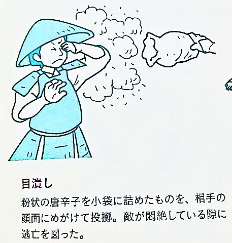 また、粉状のトウガラシを小袋に詰めた「目潰し」を、敵の顔面にめがけて投げ、相手が悶絶しているスキに逃げることも・・・