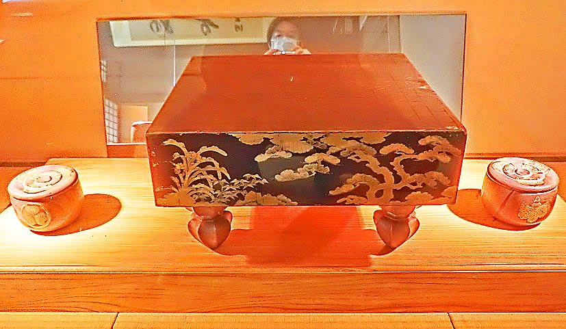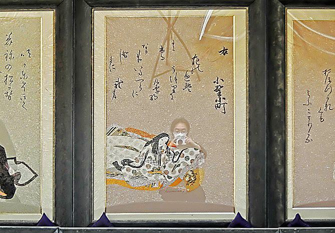 伝説の平安美女、「小野小町」嬢の御姿を発見し、嬉々として撮影する私の姿が、たまたま(本当ですよ)、小町嬢の御顔と「頬を寄せ合ったラブラブな2ショット」(笑)になる形で、ガラスに反映されてしまっておりました・・・