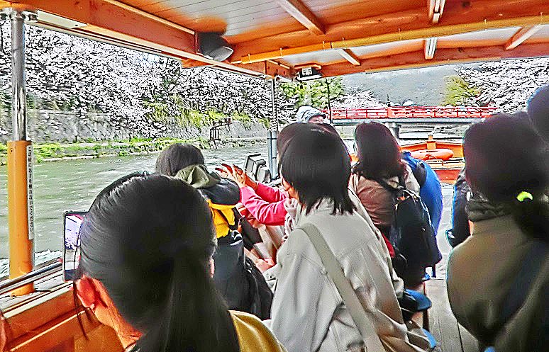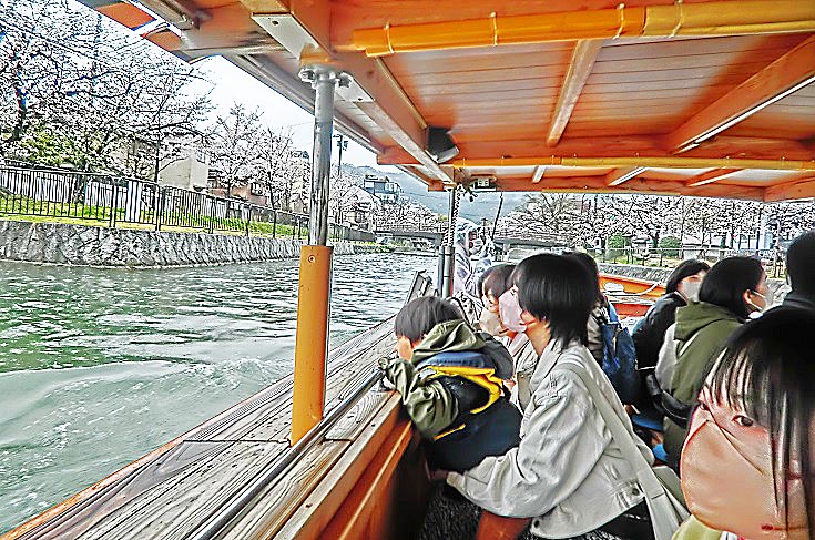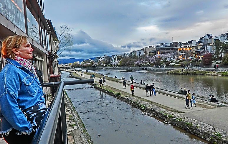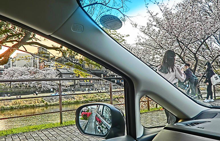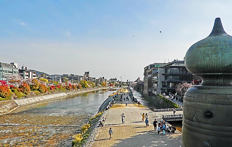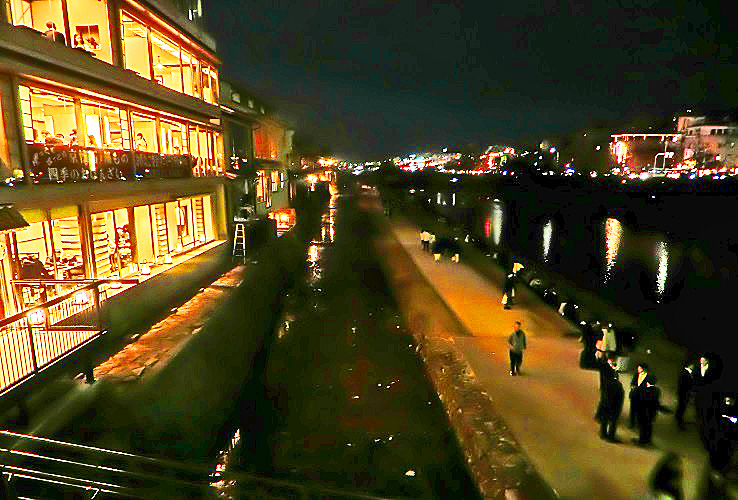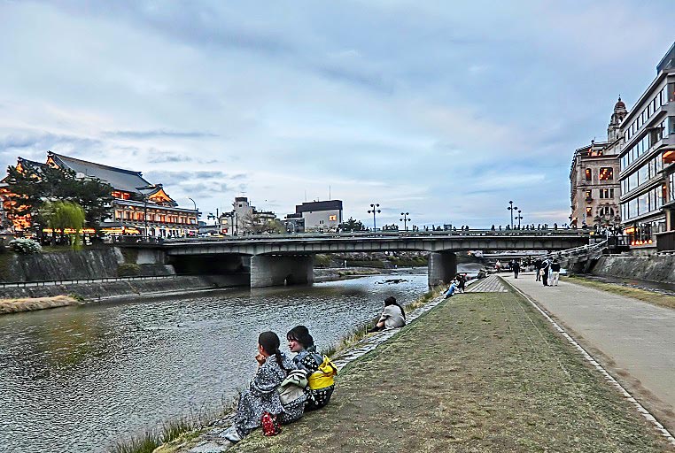 数百メートルも続く、長~い先斗町を抜けて左折し、四条通りに出ると、すぐに鴨川が・・・かなり寒い時期になりましたが、それでも元気な若者たちは、いつものように、川岸(堤防)に、並んで座っていますよ。「お金持ちは先斗町に、学生諸君は鴨川に」という光景は、世の中の縮図でしょうか(笑)。