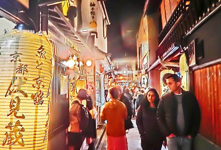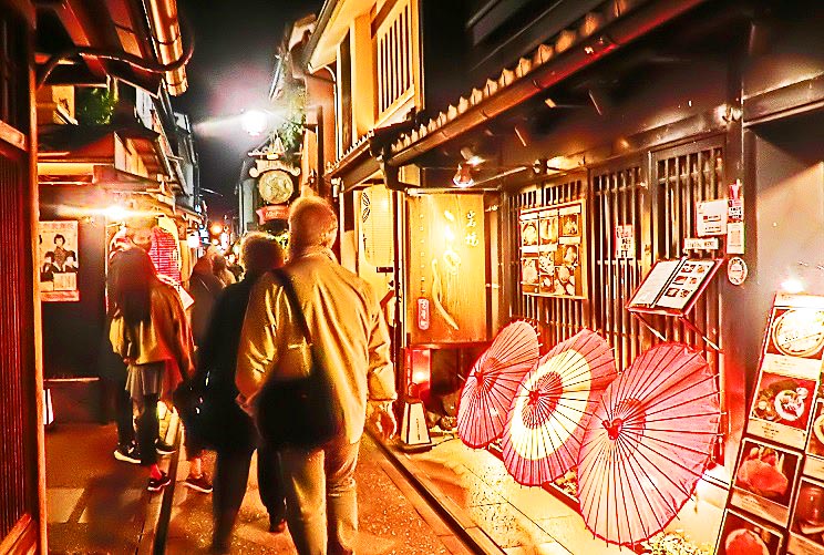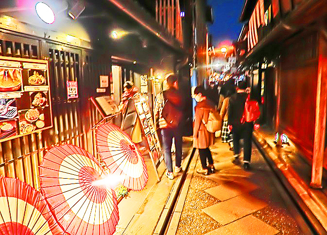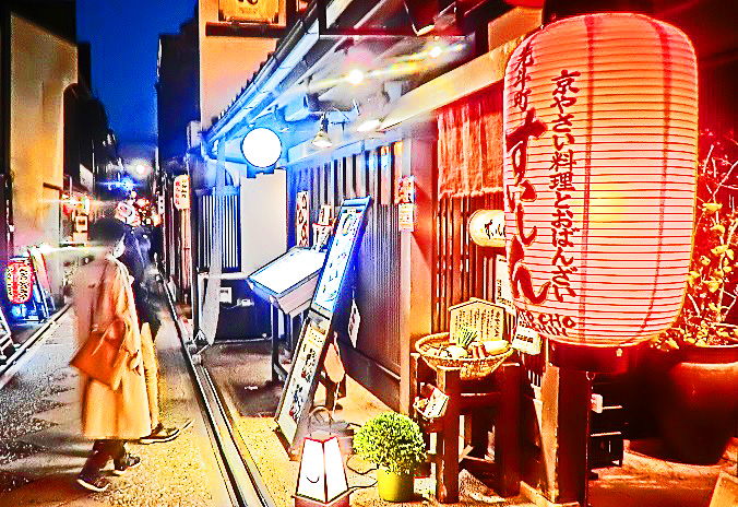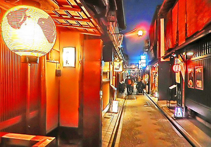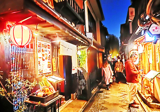 さて、夜の部に入ると、まずは、「光の学校」から徒歩10分もかからない、有名な高級料亭街の「先斗町」(ぽんとちょう)を、ぶらぶらと散策・・・京都や関西にお住いの女性の方々も、「こんなとこ、めったに夜には来れへんから、めちゃ楽しいねんな~!!」(関西なまりで)と、大喜び(笑)。