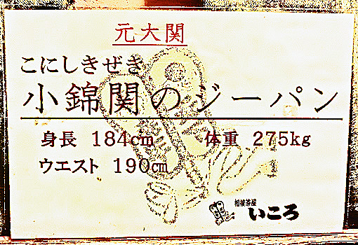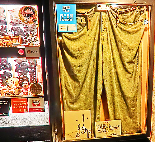八坂神社から、知恩院の方向へ歩いていると・・・ある「ちゃんこ料理」のお店の外に、元・大関でいらっしゃる「小錦」(こにしき)関のジーパンが、飾ってあるのを発見。