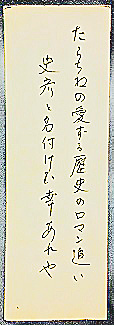 私が生まれた時、父は、「たらちねの 愛する歴史のロマン追い 史彦と名付けむ幸あれや」という歌を詠み、短冊に記してくれました。その短冊は、今でも、私の宝物です。(ちなみに、流産したり、なかなか子供ができなかったとのことで、30歳前後であろう母が幸せそうに抱いているのは、もちろん私です・・・お決まりの、指をくわえたポーズですね・・・笑)