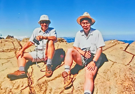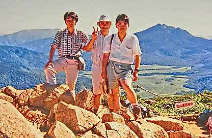 私が成長するにつれて、私の方から父を誘い、あちこちの山を登りに行きました。次の写真は、向かって右端が私で、左端が弟(九州大学大学院で野鳥の研究を行って農学博士になり、今は、日本野鳥の会の県支部長と、環境保護関係の研究所長をしています)で、真ん中でVサインをしているのが父親・・・場所は、「至仏山」(しぶつさん)の山頂かその付近であり、背景に広がっているのは、広大な「尾瀬ヶ原」ですよ。