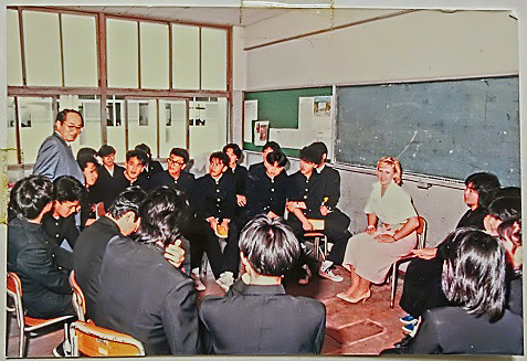 ちなみに、英語の授業を行っている父の姿が、これ・・・どうやら、金髪の外国人女性をお招きして、英語で交流会を開いている模様ですね・・・なにしろ田舎町ですから、生まれて初めて金髪美女を目の前で見たであろう男子たちの目が、キラキラのハートマークになっていますよ(笑)。