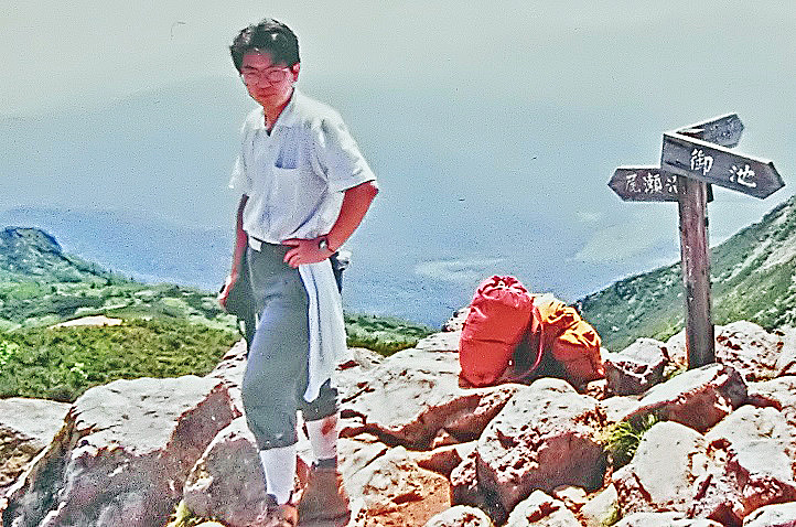 この時とは別に、東北地方の最高峰である、「燧ケ岳」(ひうちがたけ)にも登りました・・・背後には、「尾瀬沼」が見えていますよ。足に怪我をして、血がにじんでいるような・・・それで、痛みをこらえた、厳しい顔をしているのでしょうか?(おそらく、お腹が出てきていますから、30代後半の私だと思います)