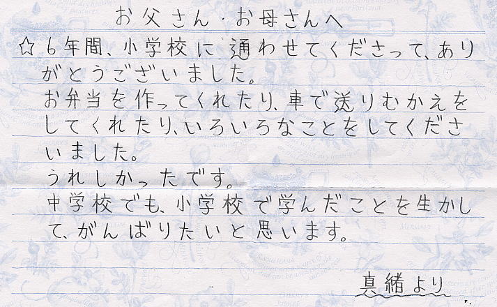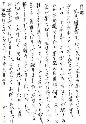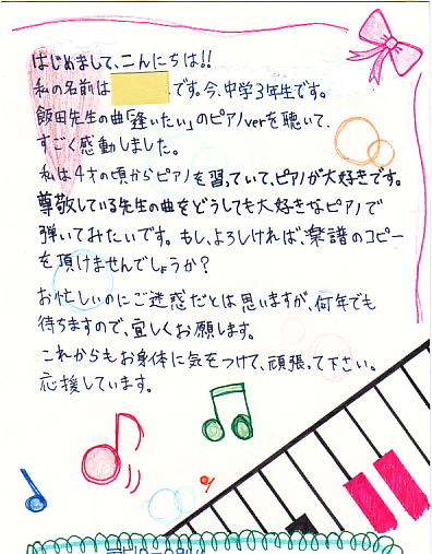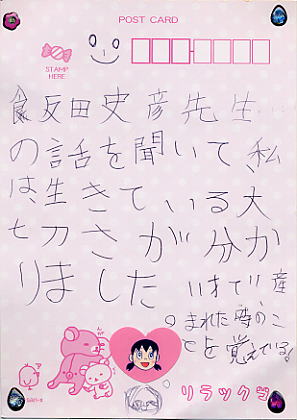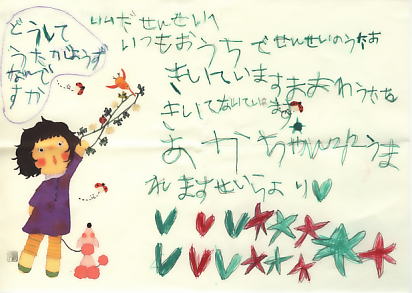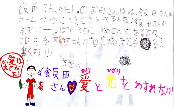 そこで、本日いただいたお手紙の中から、6才の「青空」(せいら)ちゃんが僕にくださった、嬉しい御言葉をご紹介しておきましょう。