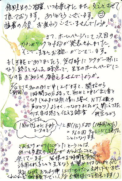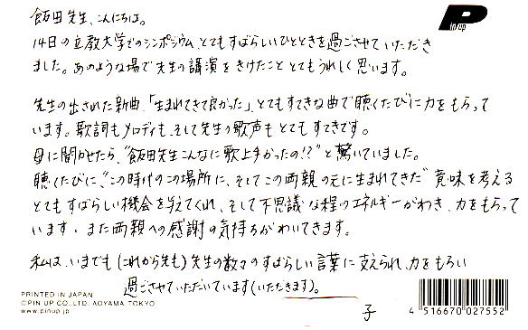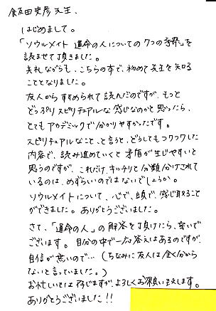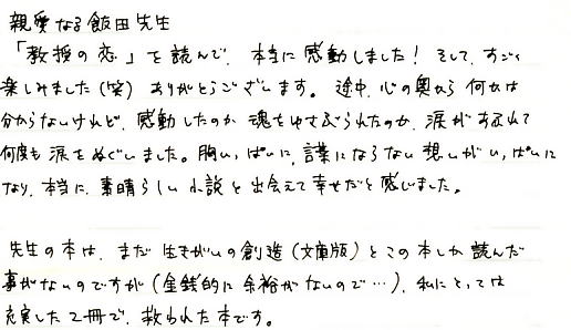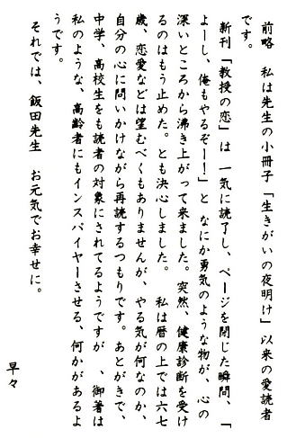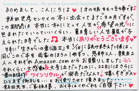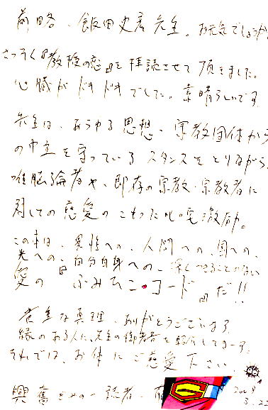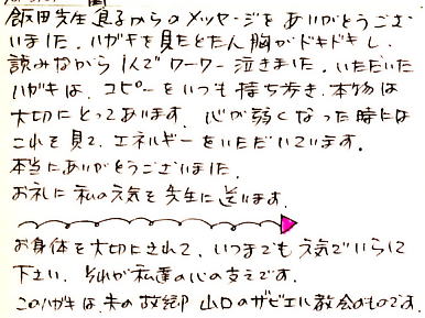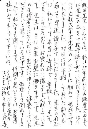 以上、飯田史彦先生の病状のご報告と、(いかにも先生らしいお茶目な)伝言でございます。
