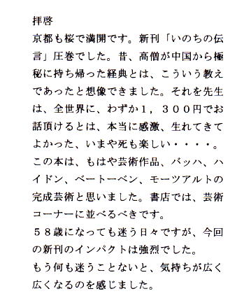 そこで、私は、この素晴らしい問題意識をお持ちのお坊さんに、次のようにお返事いたしました。唯物主義の弊害が広がる日本の仏教界にも、まだこのような真面目なお坊さんが残っていらっしゃるのだと思うと、本当に心が洗われるような、救われた気持ちになったからです。(ついでに、京都大学での講演を本にした『生きがいの創造V』を、同封しておきました。このお坊さんはインターネットをなさっておらず、私のホームページもお読みでなく、私の近年の本はご存じないものと判断したからです)