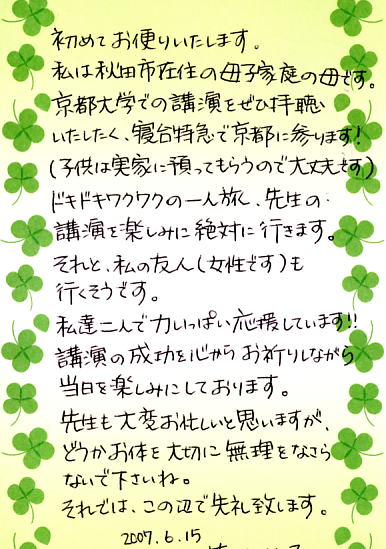 お手紙拝受いたしました。講演のご依頼、誠にありがたく光栄に思います。現在、私は諸事情のため、ごく一部の医療関係の講演のみしかお受けしておりませんが、**様のお手紙を拝読して心を動かされましたので、喜んでお受けさせていただきます。当方の予定としては、ご希望の十一月十五日で結構ですので、ご希望の時刻と演題をご指定ください。なお、講演料は無料ですので、福島〜京都間の交通費と、1泊分の宿泊費相当分をご負担いただければ結構です。それでは、お返事をお待ちしております。