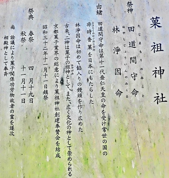 大昔に、貴重なお菓子を日本にもたらした「田道間守命」(たじまもりのみこと)と、日本で初めて餡(あん)入りの饅頭を造って広めた「林淨因命」(はやしじょういんのみこと)を、「菓子の祖神(おやがみ)」として、祀(まつ)っています。ご利益の根拠がハッキリしない、納得のいかない神社が多い中で、これほど由緒の明確な神社であれば、いかにも大きなご利益がいただけそうですよね。