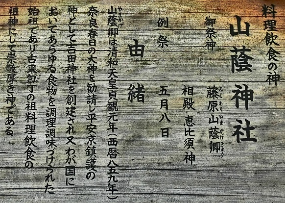 ご祭神の「藤原山蔭」(ふじわらのやまかげ)は、西暦800年代に、「わが国の、あらゆる食物を調理調味づけられた始祖」でいらっしゃり、古来、「包丁の祖、料理飲食の祖神」として、崇敬(すうけい)されているとのこと!!