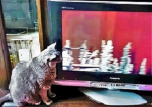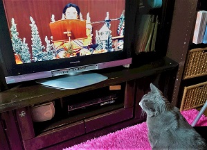 このお宅には、1匹のネコが同居しているのですが・・・サントリーホール公演のDVDの鑑賞を始めたとたん、テレビ画面の近くにやって来て、じ〜っと画面に見入ったり、テレビ画面の周囲をウロウロと歩き回ったりしながら、きわめてゴキゲンな表情で、うっとりと居座ったのだそうです。このネコちゃんは、ふだん、テレビ番組には全く興味を示すことが無いので、そのスタッフはビックリ仰天し、そのうち、「この珍しい姿を撮影しておこう」と、気づいたとのこと。これらが、その証拠写真・・・