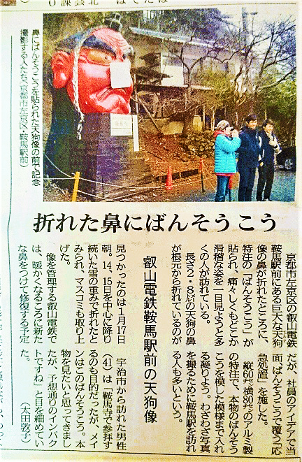 雪の重みで根元から折れてしまい、空洞部分に「ばんそうこう」を張って修理に出されていた、鞍馬駅の「天狗像」の鼻(2月12日版を参照)が、見事に復活していましたよ。めでたし、めでたし!!(笑)