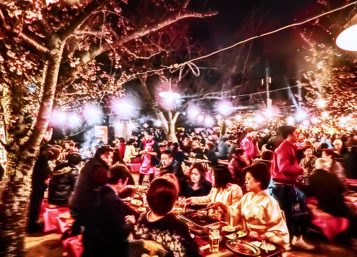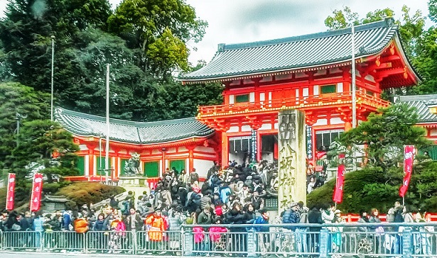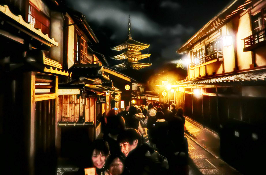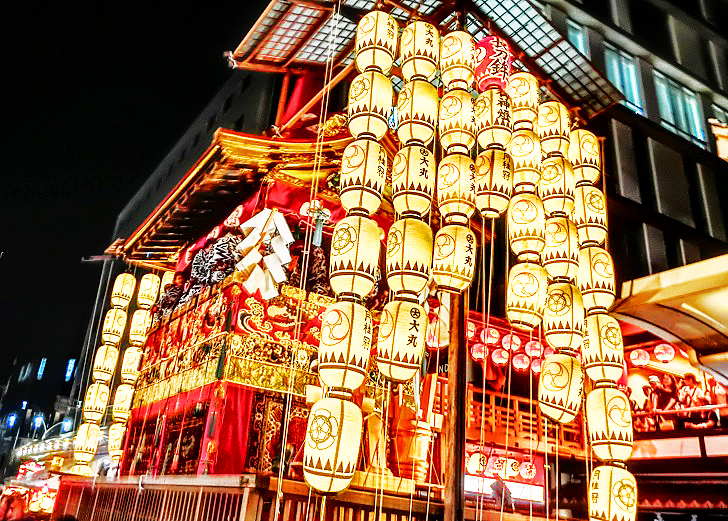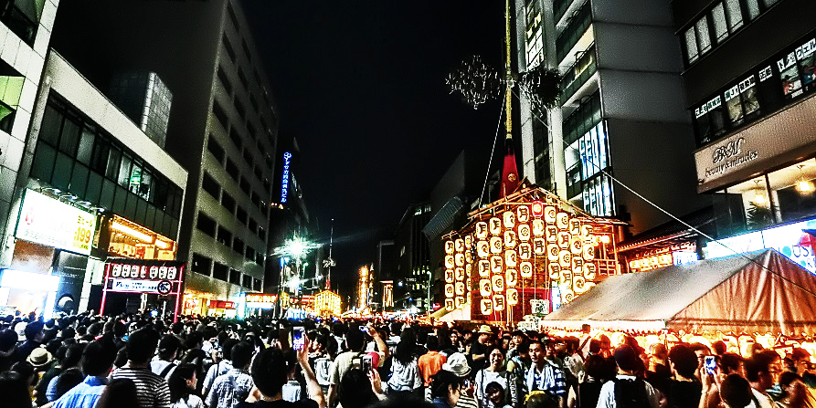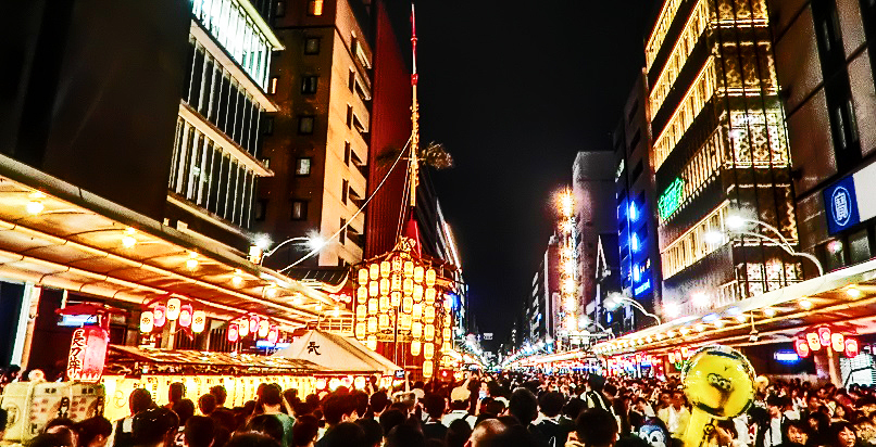 京の都の夜空に輝く、鮮やかな山鉾(やまぼこ)たちと、歓声を上げながら鑑賞する、何十万人もの群衆・・・