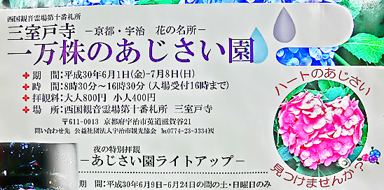今年も、ハートメイツのお客様からのご依頼で、京都郊外の「三室戸寺」(みむろとじ)にある「あじさい園」を、訪れてみましたよ。
