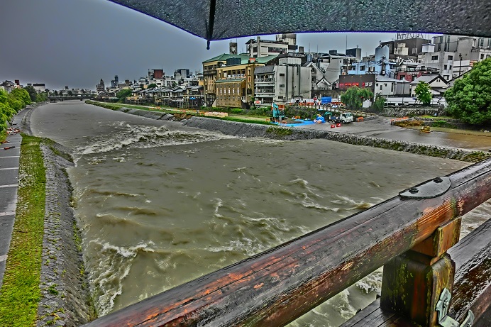 まずは、「光の学校」から三条通りを数百メートル歩いた地点に架かる、京都の中心であり「東海道五十三次」の終点でもある「三条大橋」(江戸時代までは、有名人たちが、ここで「さらし首」になっておりました)は・・・本日は水位が下がってきたものの、まだまだ、勢いよく濁流が・・・