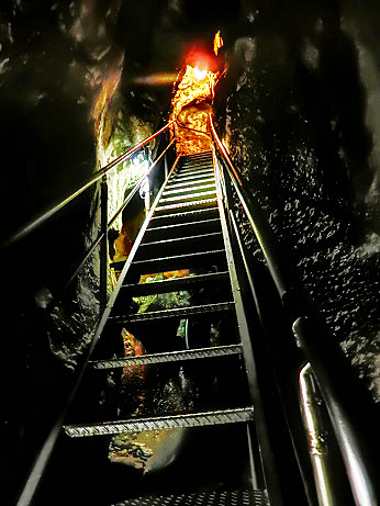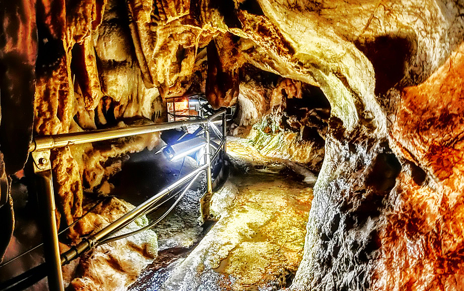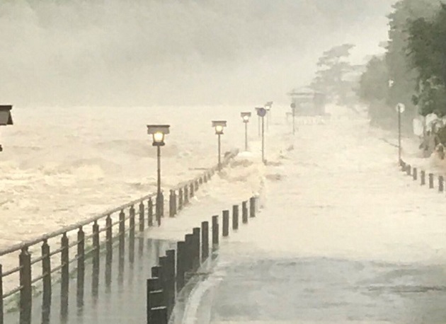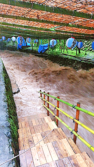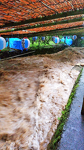 いつもは多数の観光客が行き交う遊歩道も、激しい水流が流れ込んで、通行止めに!!