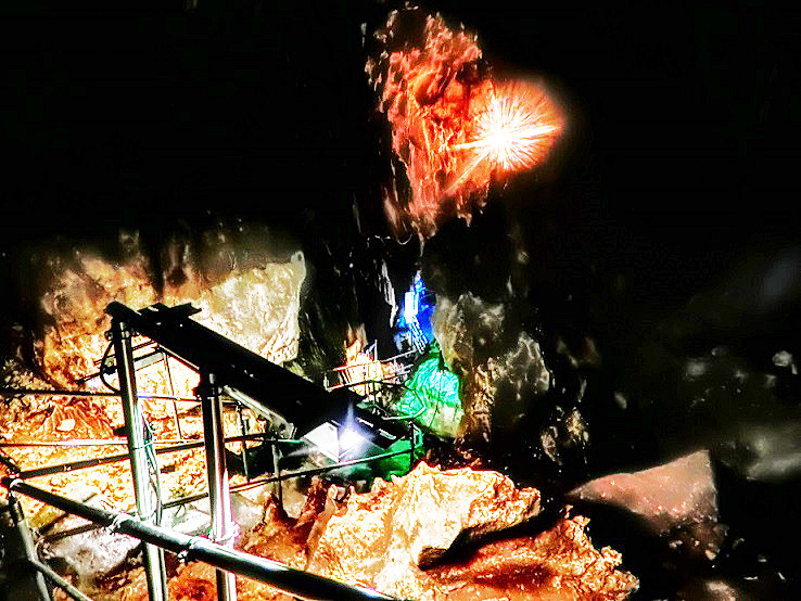 おっと、早くも、工事業者さんが入って、雨の中、修復作業を始めておられます!!