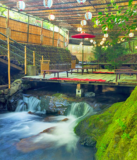 山の中腹の渓流にある、大好きな「貴船(きふね)の川床(かわどこ)」は大丈夫かと心配になり、何度も訪れた「貴船茶屋」さんのHPを調べてみたところ・・・いつもは、これほどに風雅な世界でお食事ができる、素晴らしい川床が・・・