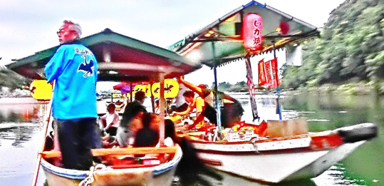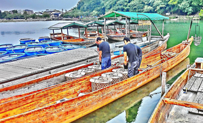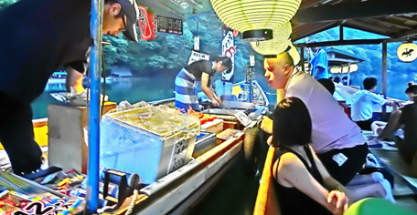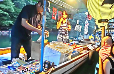 乗り場の横の鵜飼い船で、乗客たちに背を向けながらコソコソと、