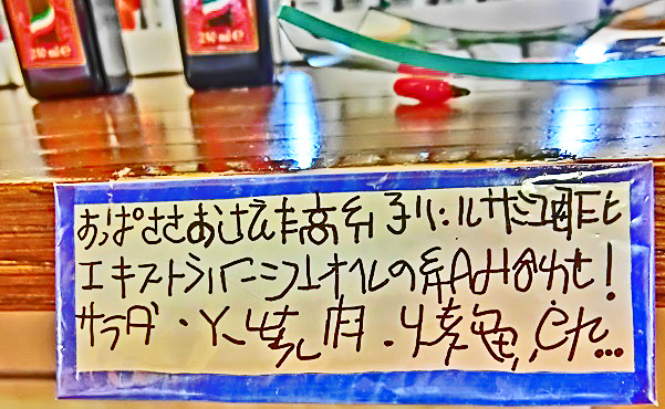 かつて、イタリアでトイレ休憩をした際に、併設されていた売店で、このような不気味な宣伝文を発見・・・見た瞬間には、まさか「日本語」だとは思わなかったのですが、しばらく見つめているうちに、まるで「象形文字を解読する考古学者」のように、ある日本語の文章が浮かんできたのです!!