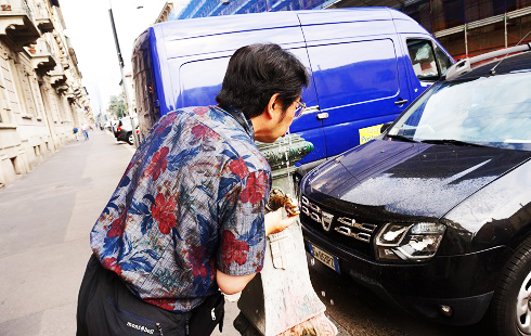 そう、ミラノの街角にあった水飲み場で、水分を補給中の私・・・うまく噴き出して来ない水に集中する、私の真剣な後ろ姿は、当然ながら滑稽(こっけい)で、コメディアンのようですねぇ・・・(笑)