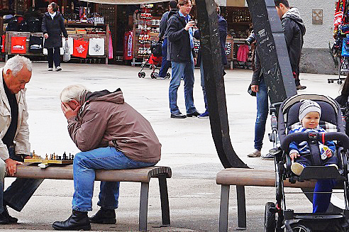 なぜなら・・・まずは、左側で「チェス」(西洋式将棋)に興じている、2人のお爺さんたちの姿が、実に、ドラマティックだからです(笑)。