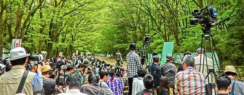 報道カメラマンさんたちが、白熱した撮影合戦を展開中。