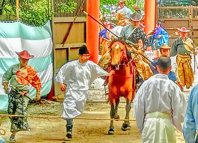 出番を待つ馬と武者たちが、隣りにある河合神社の境内に、