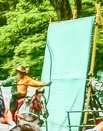 馬はほとんど見えず、馬上の騎馬武者の上半身だけが見える状況。